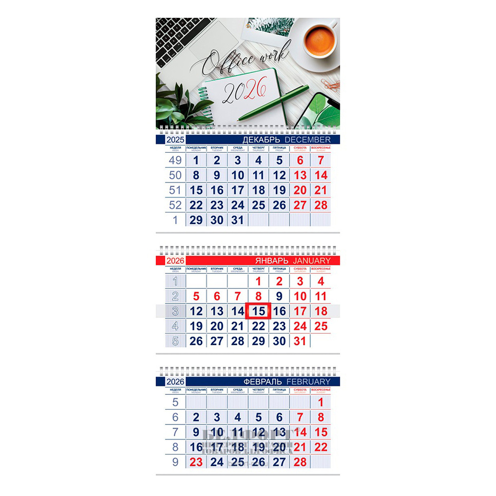 Календарь квартальный 2026г. 3-х блочный на 3гребнях, 750мм*297мм, Hatber, "Офис.Мой офис", с бегунком