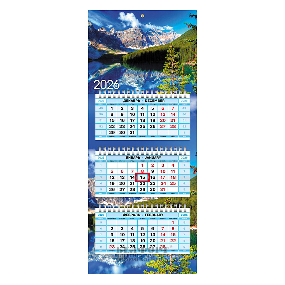 Календарь квартальный 2026г. 3-х блочный на 3гребнях, 470мм*195мм, Hatber, МИНИ 3, "Озеро в горах", с бегунком
