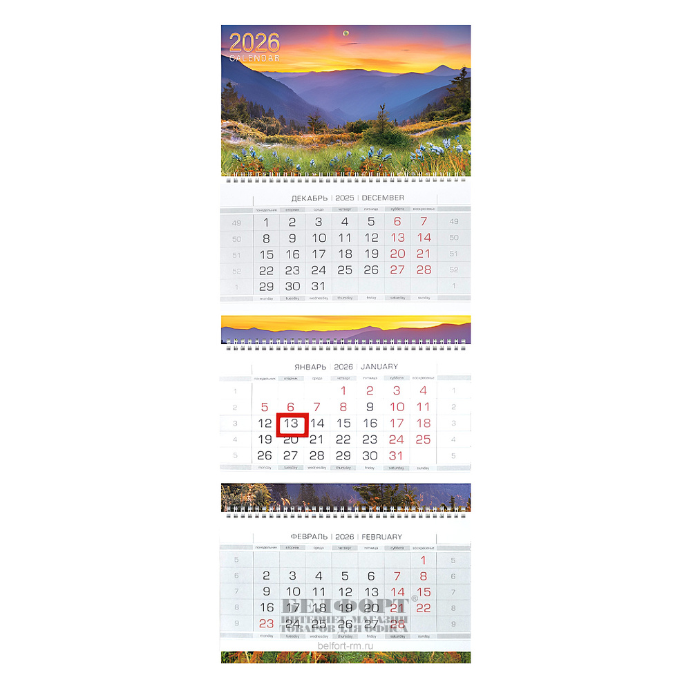 Календарь квартальный 2026г. 3-х блочный на 3гребнях, 758мм*297мм, Hatber, "Люкс.Краски природы", с бегунком, 2х цв. блок, цветная подложка