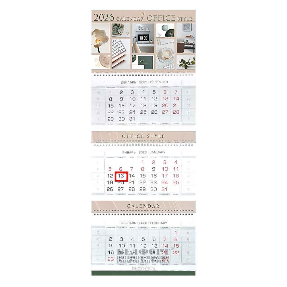 Календарь квартальный 2026г. 3-х блочный на 3гребнях, 758мм*297мм, Hatber, "Люкс.Office Style", с бегунком, 2х цв. блок, цветная подложка