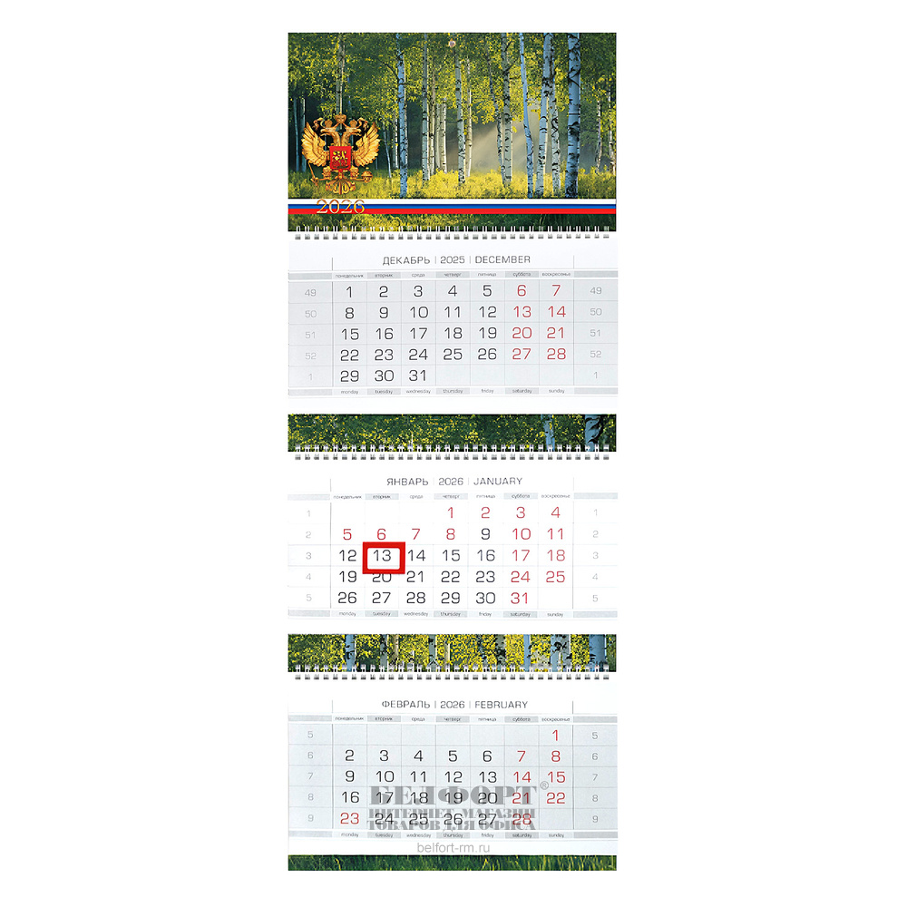 Календарь квартальный 2026г. 3-х блочный на 3гребнях, 758мм*297мм, Hatber, "Люкс.Россия", с бегунком, 2х цв. блок, цветная подложка