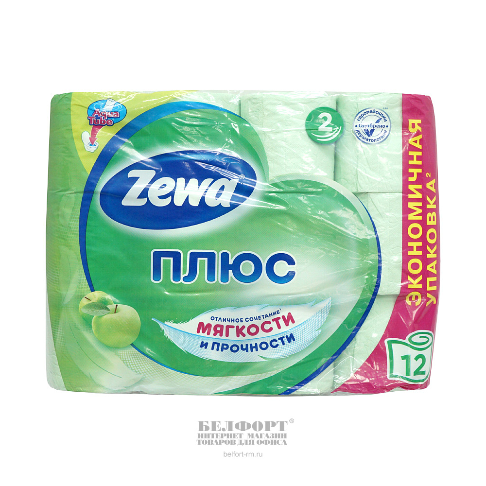Бумага туалетная 2-слойн., Zewa, "Плюс", "Яблоко", зеленая, 26м, 208л, 12,5см*9,5см, 12шт, с втулкой, с тиснением, перфорация есть