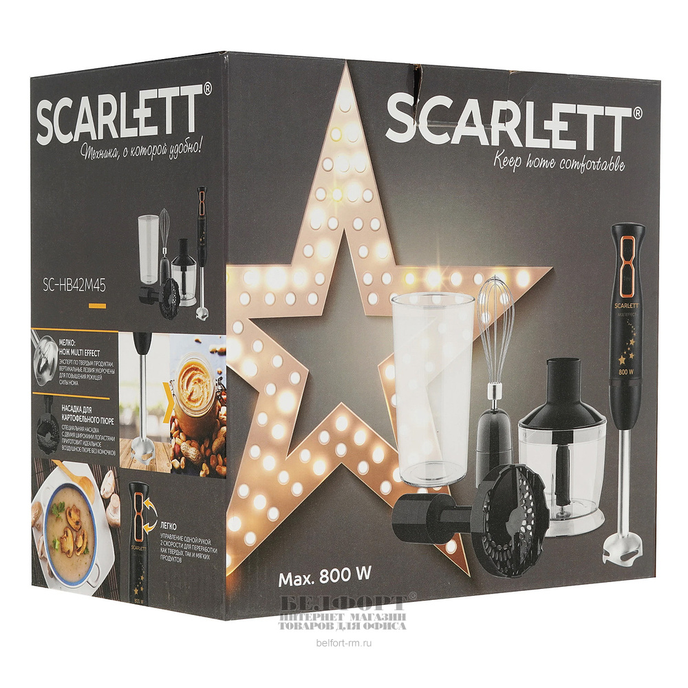 В разобранном виде блендер не займет много места при хранении благодаря компактным размерам. Модель укомплектована чашей-измельчителем с вместительностью 0.6 л, мерным стаканом с аналогичной емкостью и венчиком для взбивания, также в комплект поставки входит насадка для приготовления пюре. С ее помощью вы сможете превратить вареный картофель в воздушное пюре без комочков. Блендер Scarlett SC-HB42M45 оснащен укороченными лезвиями из прочной нержавеющей стали, которые способны без труда справиться с измельчением твердых продуктов.