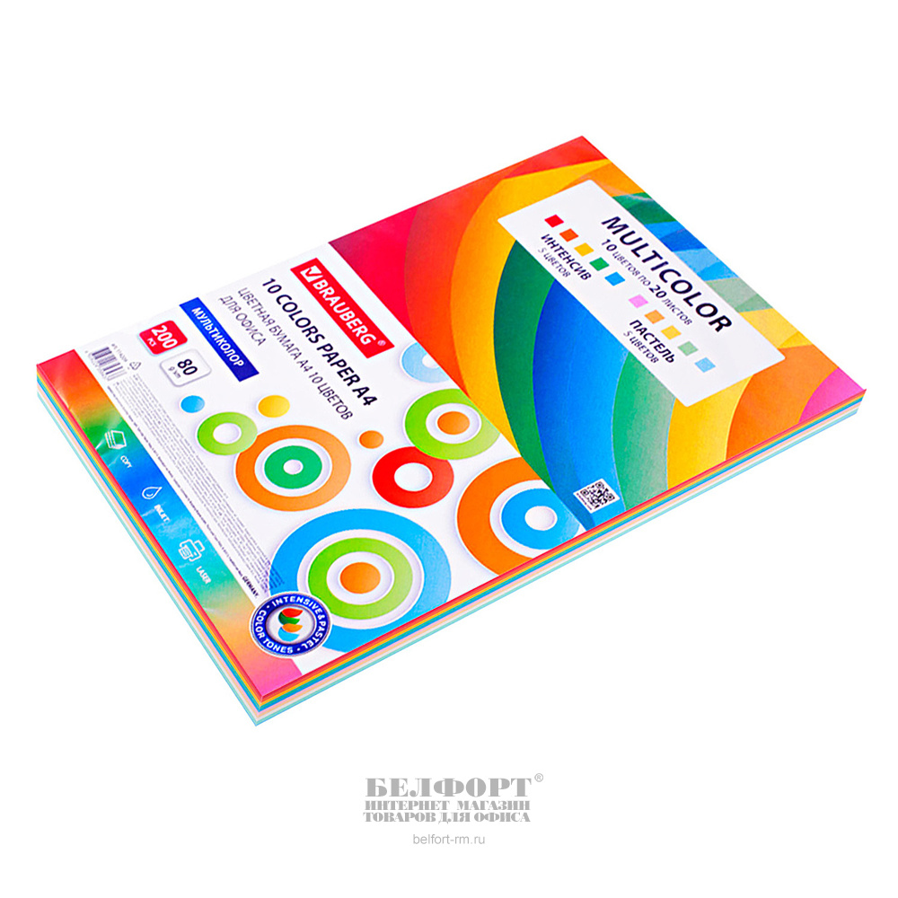 Бумага Mixed Brauberg, "Multicolor", А4, 80г⁄м², 200л, ассорти intensive (интенсивный)+pastel (пастельный), 10цв по 20л