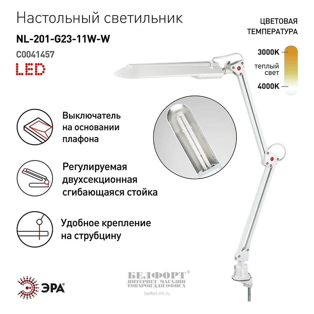 Добавить к сравнению174192Есть в наличии 4 шт.Светильник настольный ЭРА, NL-201, на струбцине, 11 Вт, черный, G23, кнопочный, металл+пластик