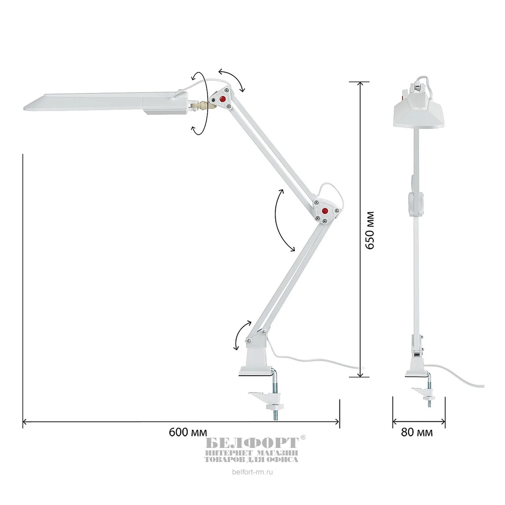 Светильник предназначен для использования с энергосберегающей лампой, лампа входит к комплект. Удобное крепление на струбцину к любой плоской поверхности. Высота плафона регулируется двухсекционной сгибающейся стойкой.
