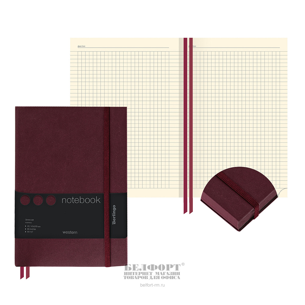 Добавить к сравнению263459Есть в наличии 1 шт.Записная книжка А5, 210мм*143мм, Berlingo, "Western", 80л, клетка, твердая обл., в твердом переплете, кожзам, синяя, кремовая блок, ляссе, синий срез, на резинке
