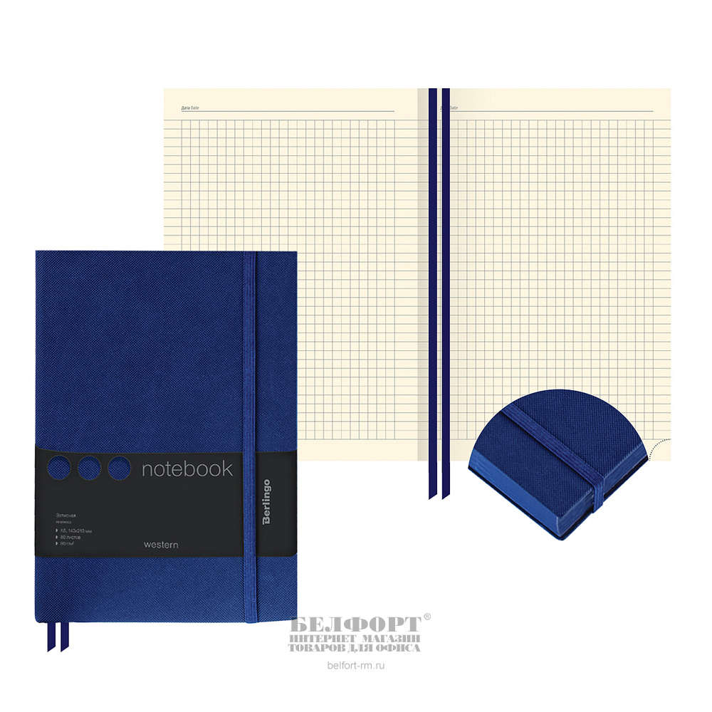 Записная книжка А5, 210мм*143мм, Berlingo, "Western", 80л, клетка, твердая обл., в твердом переплете, кожзам, синяя, кремовая блок, ляссе, синий срез, на резинке