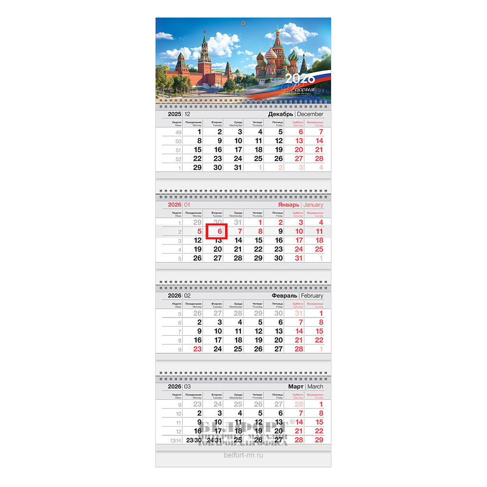 Календарь квартальный 2026г. 3-х блочный на 3гребнях, 750мм*297мм, Hatber, "Офис.Россия", с бегунком