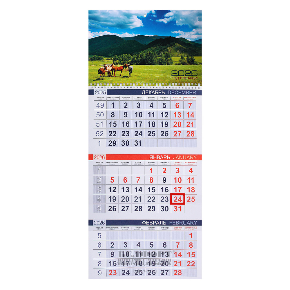 Календарь квартальный 2026г. 3-х блочный на 1гребне, 690мм*298мм, Hatber, "Эконом. Год лошади", с бегунком
