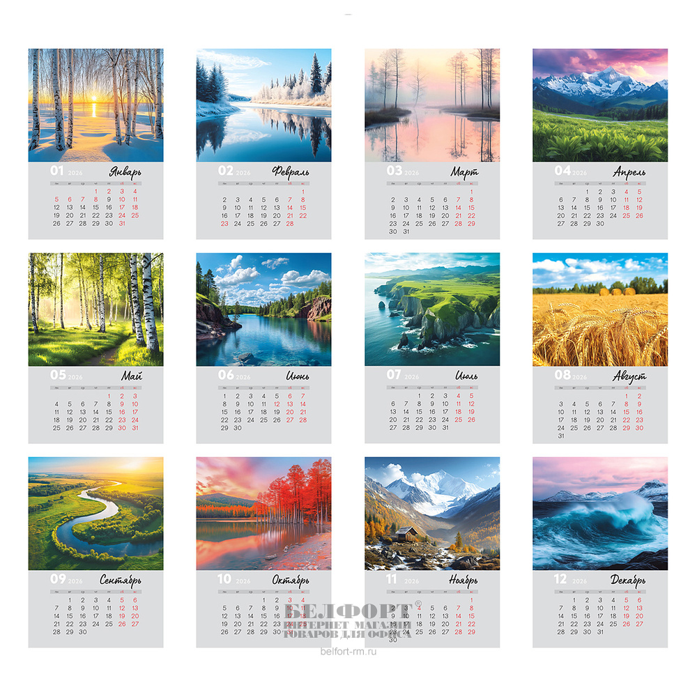 Добавить к сравнению259941Есть в наличии 1 шт.Календарь настенный перекидной 2026г. 6л, на гребне с ригелем, 480мм*340мм, BG, "Природа"