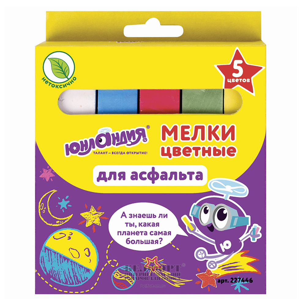 Мел цветной, для асфальта, 5цв, 5шт, Юнландия, "Юнландик и космос", квадратный, картон. уп., средней твердости