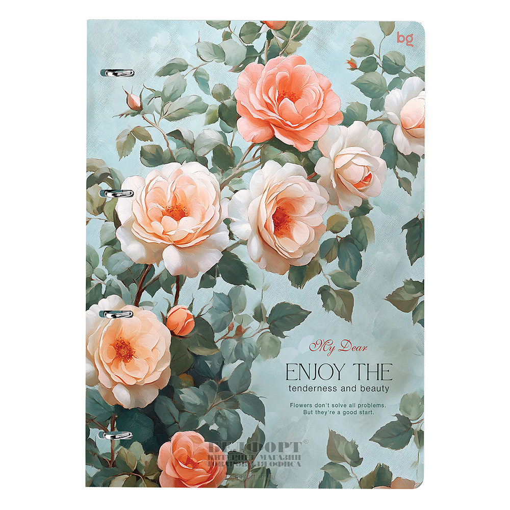Тетрадь на 4-х кольцах 120л, А4, клетка, без полей, BG, "Розы", обложка картон ламинированный, внутр. блок офсет, цветной, твердая обложка, мат. лам., тиснение ф