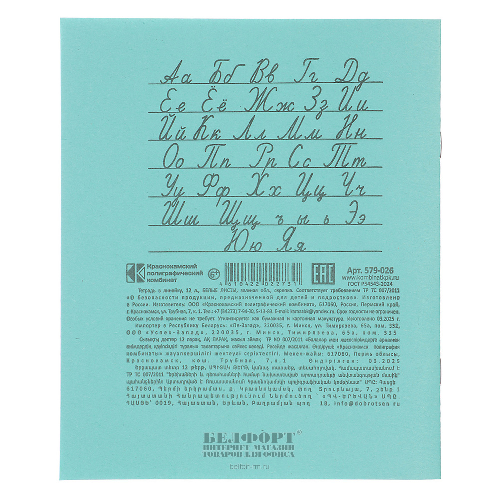 Тетрадь 12л, А5, линия, Краснокамский полиграфический комбинат, обложка бумага обложечная, внутр. блок офсет, на скрепке, зеленая, 60г⁄м², белизна 92-95%