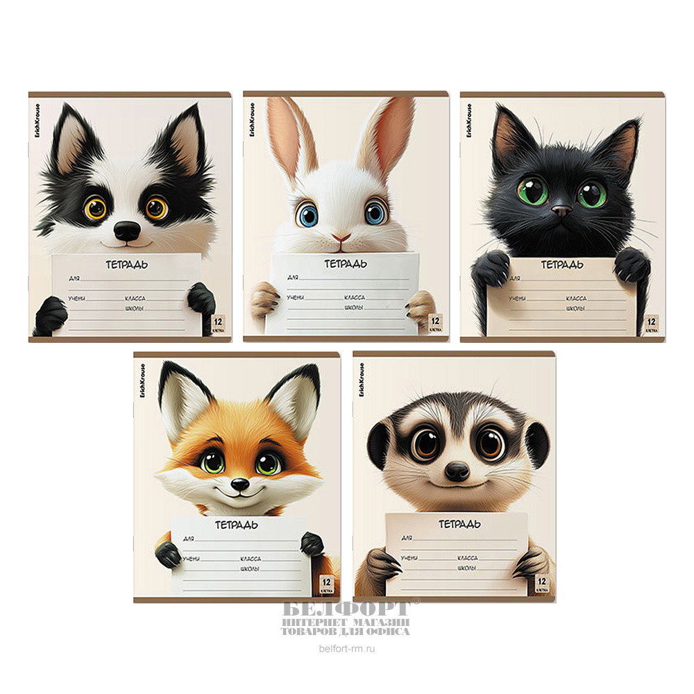 Тетрадь 12л, А5, клетка, с полями, Erich Krause, "Усатые друзья", обложка картон мелованный, внутр. блок офсет, на скрепке, ассорти, 60г⁄м², белизна 100%