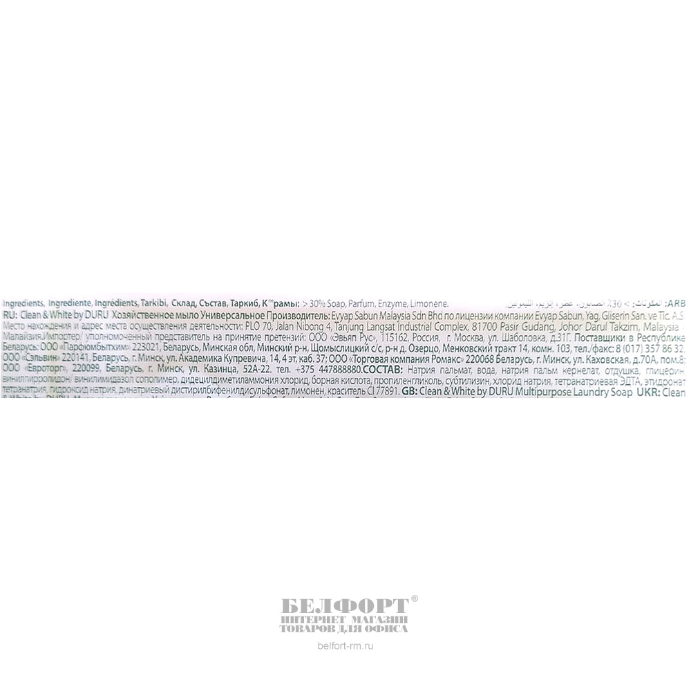 Добавить к сравнению223120Есть в наличии 15 шт.Мыло хозяйственное DURU, "Clean White", 4*120г, универсальное, в обертке