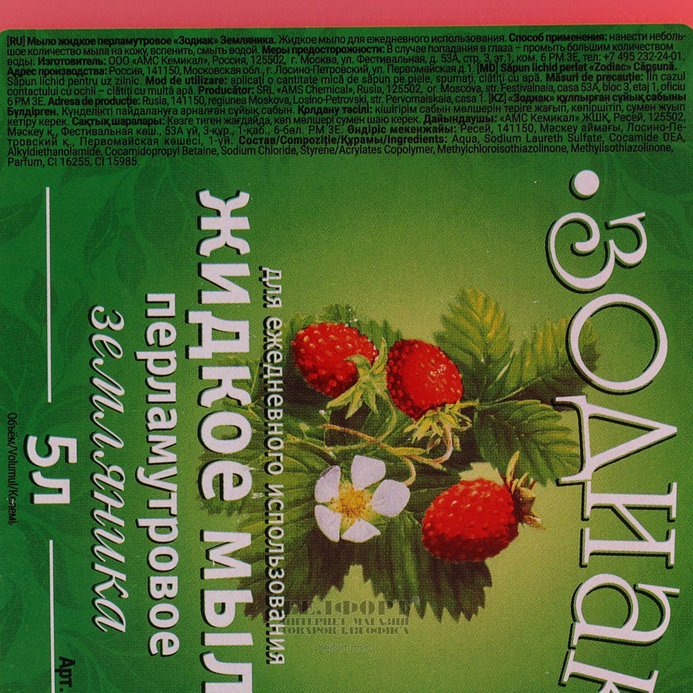 Жидкое мыло 5л, Зодиак, "Перламутровое", "Земляника", канистра