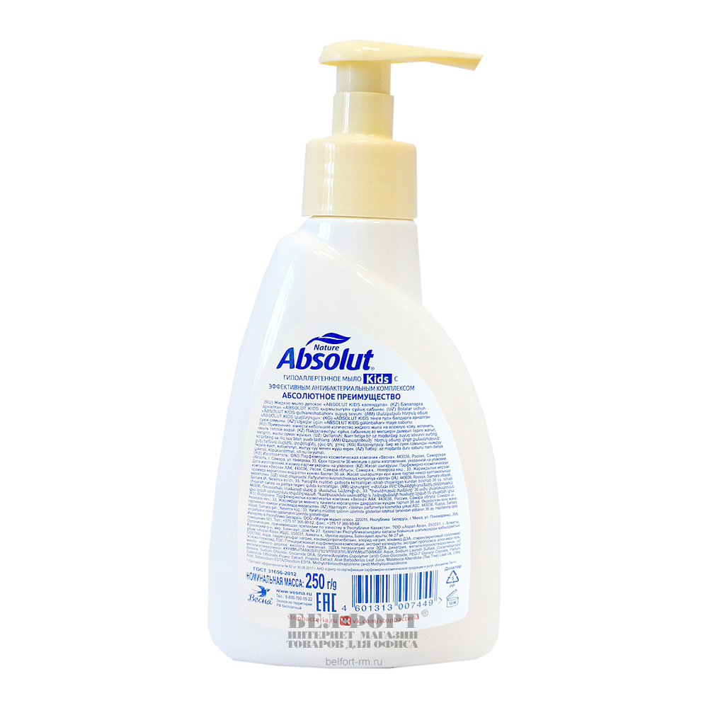 Добавить к сравнению50886Есть в наличии 65 шт.Жидкое крем-мыло 250мл, Absolut, "Нежное. Антибактериальное", дозатор