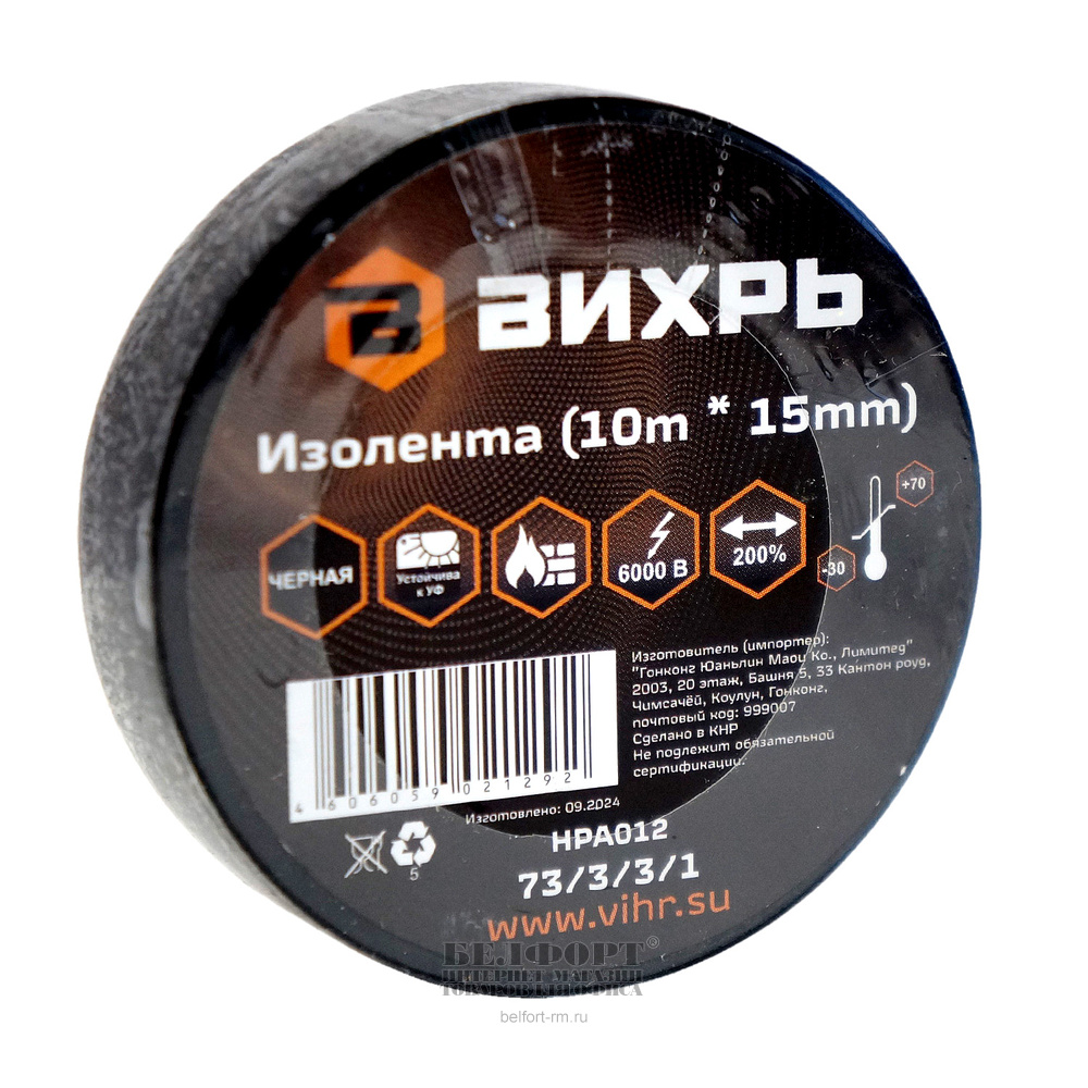 Изолента ПВХ, 10м*15мм, черная, Вихрь