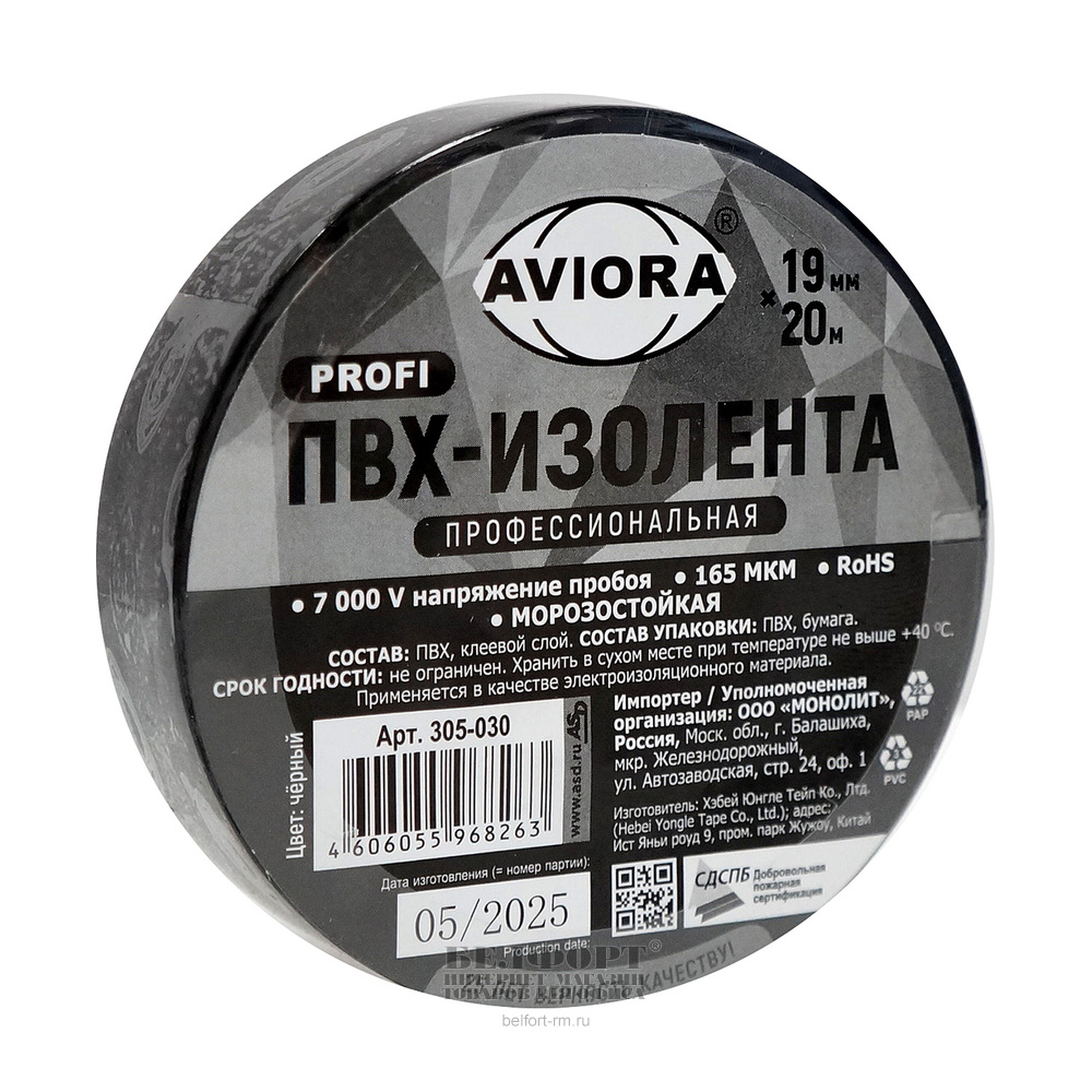 Изолента ПВХ, 20м*19мм, черная, Aviora