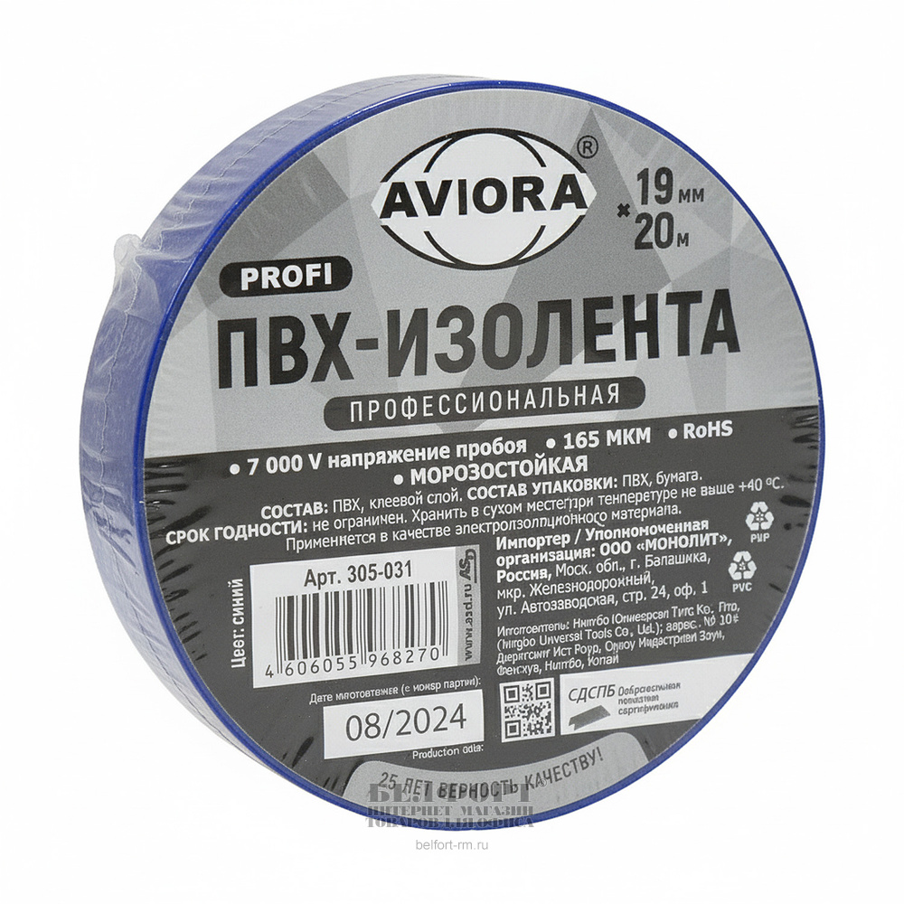 Изолента ПВХ, 20м*19мм, синяя, Aviora