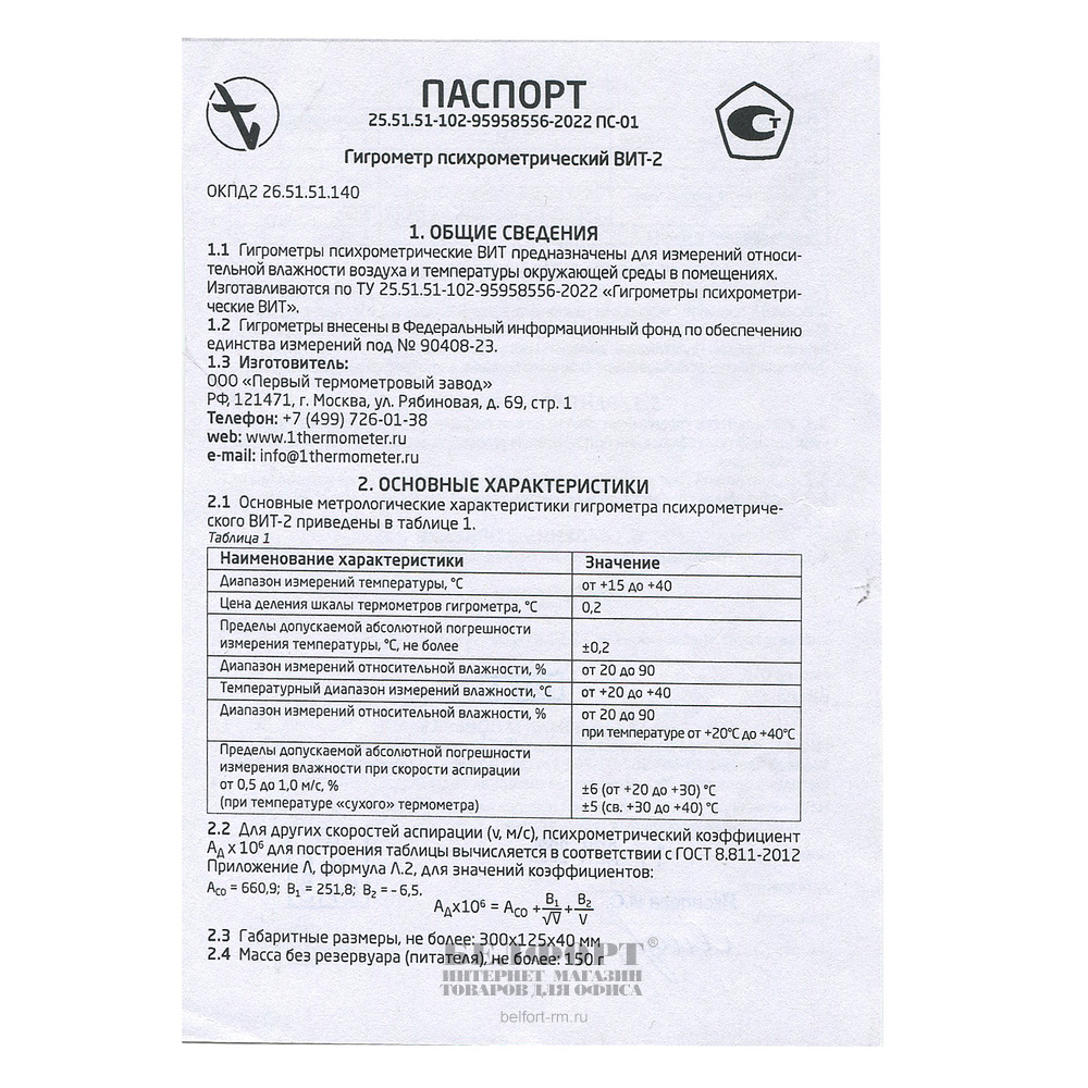 Гигрометр психрометрический ВИТ-2, (с поверкой РФ), Первый термометровый завод, Вит -2 от +15 до +40 градусов