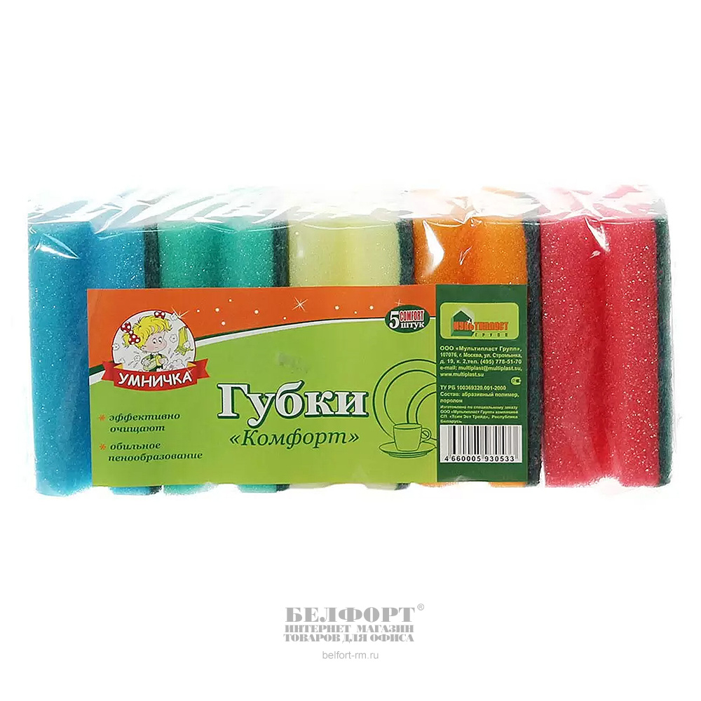 Губка для посуды, Умничка, "Комфорт", 9,6см*6,5см*4,4см, 5шт, поролон, анатомический вырез