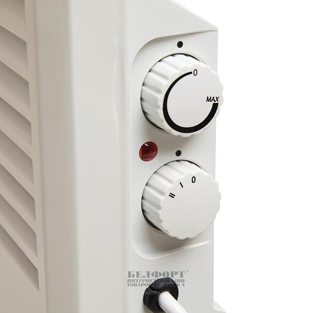 Система управления — механическая. Доступно три режима. Корпус сделан из металла и защищен от влаги в соответствии со стандартом IPX4. Нагревательный элемент выполнен из литого алюминия. Модель автоматически отключается при перегреве.