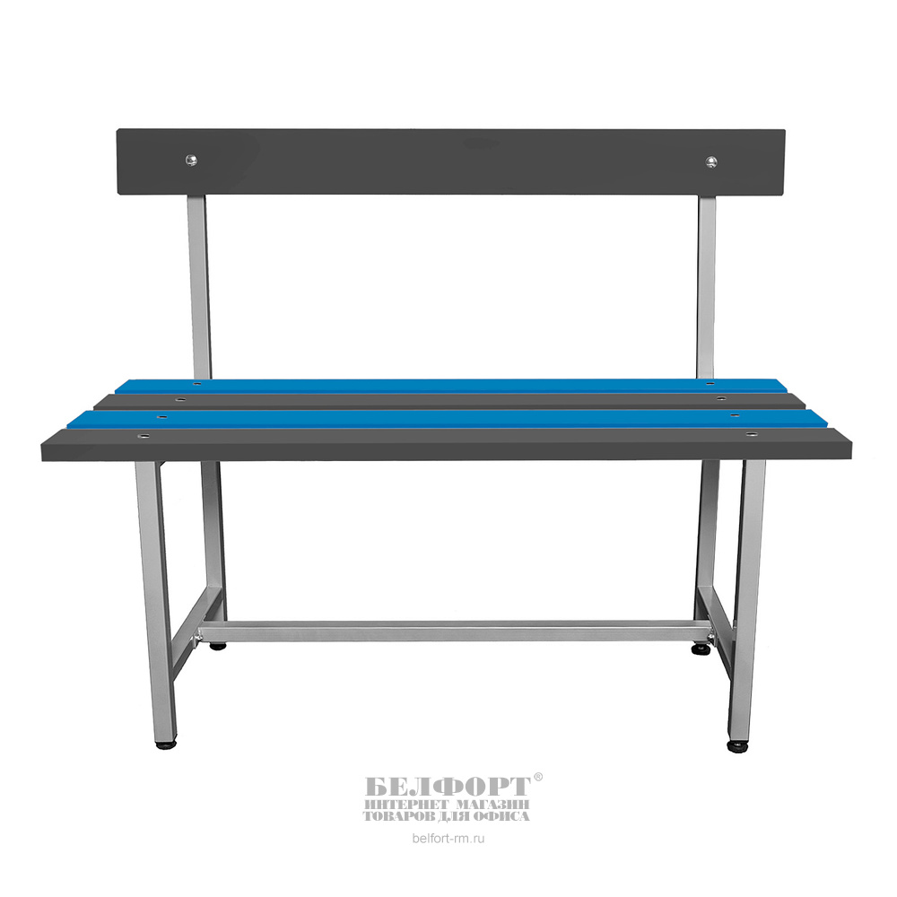 Скамья для раздевалки со спинкой. Каркас — стальная квадратная труба с полимерно-порошковым покрытием. Материал сидения и спинки — настил из полнотелой пластиковой доски, что предполагает возможность эксплуатации как в сухих, так и во влажных помещениях, и даже на улице. Опоры регулируемые по высоте. Размер (Ш*Г*В): 1000*395*860мм