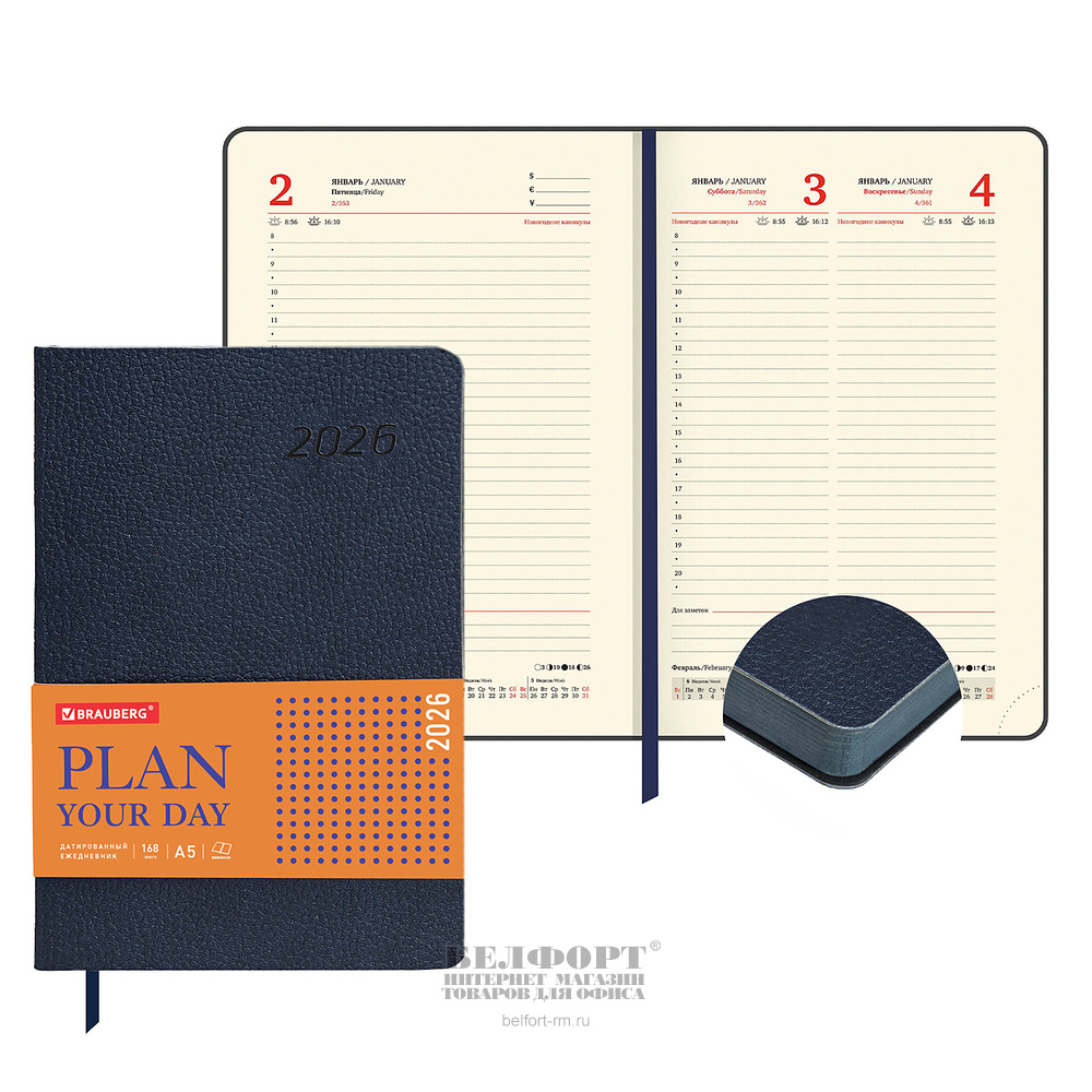 Ежедневник 2026г. А5, кожзам, Brauberg, "Stylish", 168л, 213мм*138мм, интегральный переплет, темно-синий, кремовый блок, ляссе, синий срез, скругленные уголки