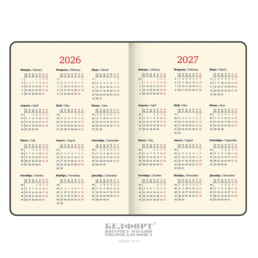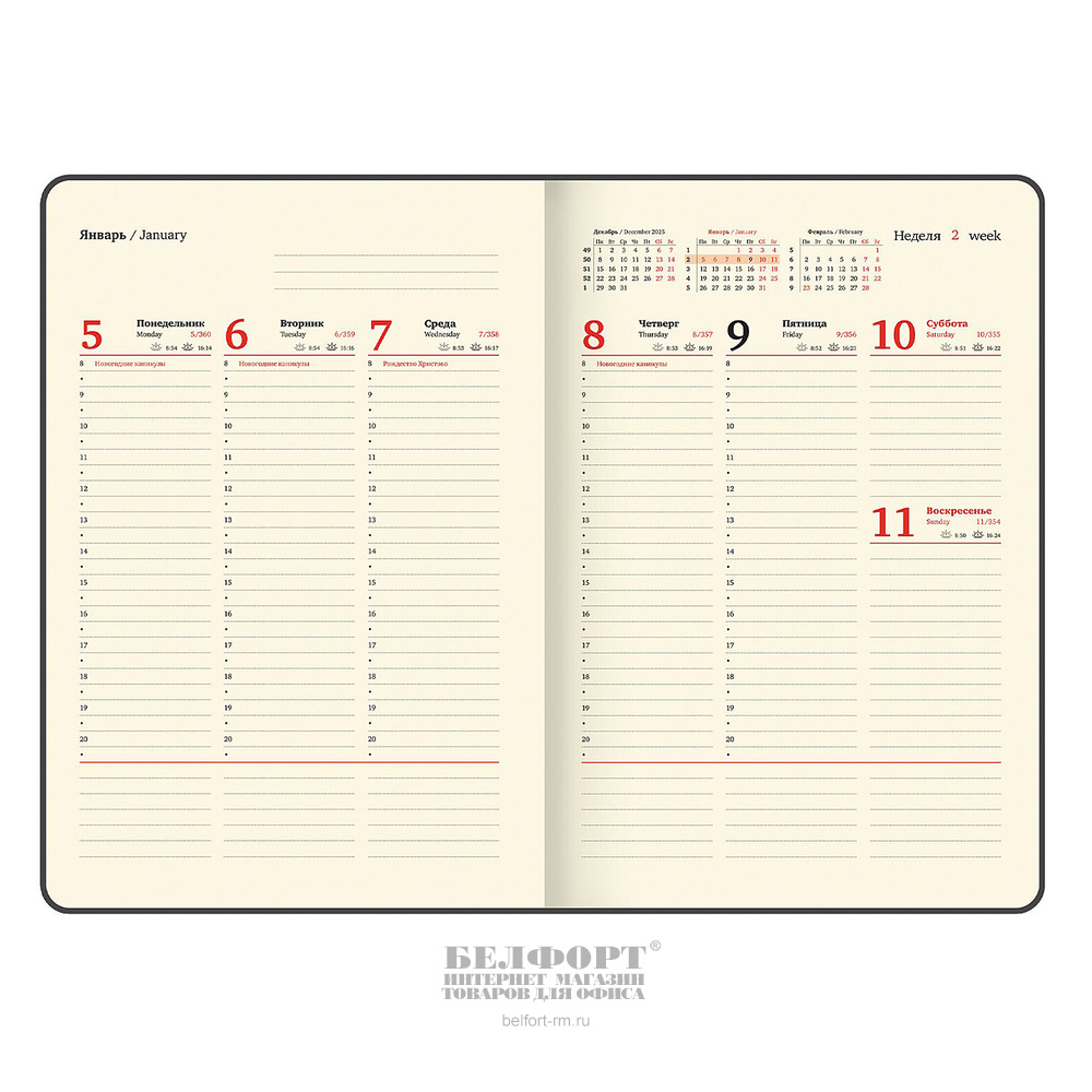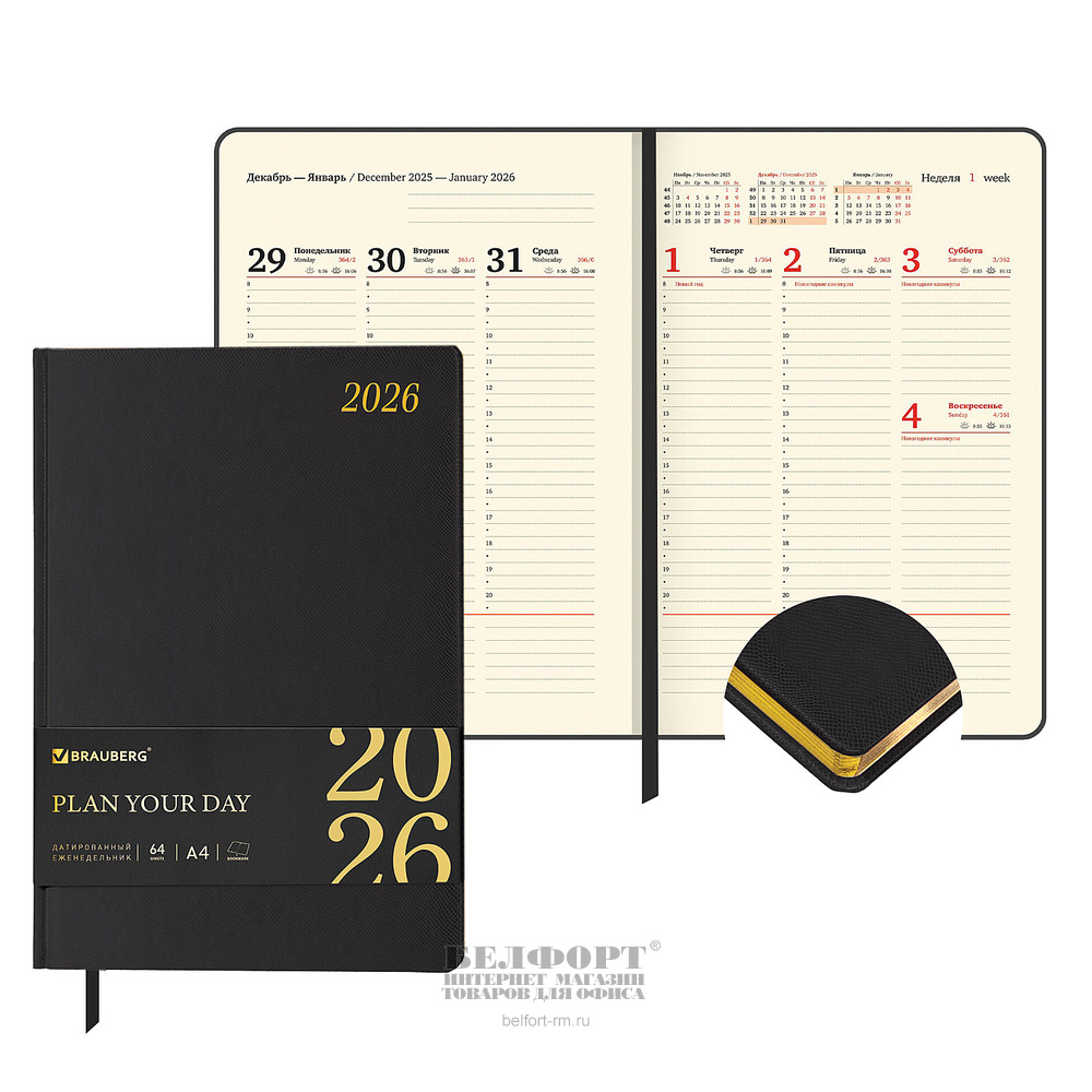 Еженедельник 2026г. А4, кожзам, Brauberg, "Iguana", 64л, в твердом переплете, черный, кремовый блок, ляссе, золотистый срез