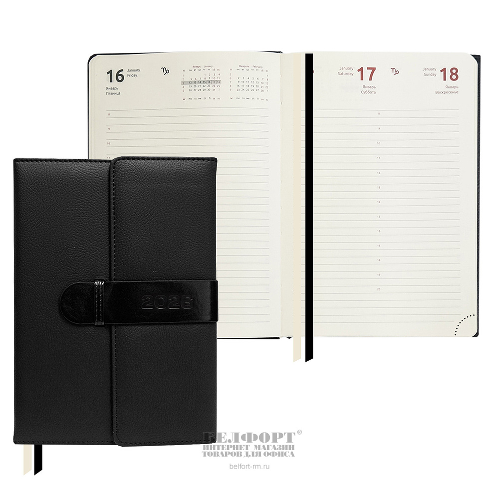Ежедневник 2026г. А5, кожзам, deVENTE, "Tudor", 168л, 205мм*145мм, в твердом переплете, черный, кремовый блок, ляссе, карман для визиток, индивид. уп.