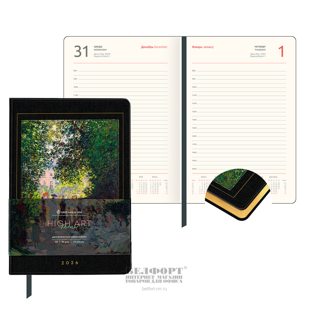 Ежедневник 2026г. А5, кожзам, Greenwich Line, "High Art. Monet", 176л, 205мм*145мм, в твердом переплете, цветной, тонированный блок, ляссе, золотистый срез, 80г,
