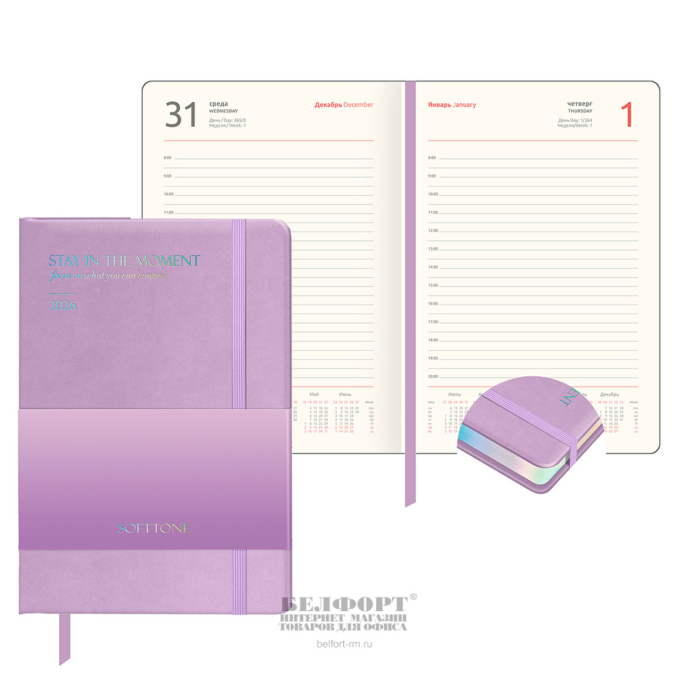 Ежедневник 2026г. А5, кожзам, Greenwich Line, "Softone", "Lilac", 176л, 205мм*145мм, в твердом переплете, сиреневый, тонированный блок, ляссе, голография срез