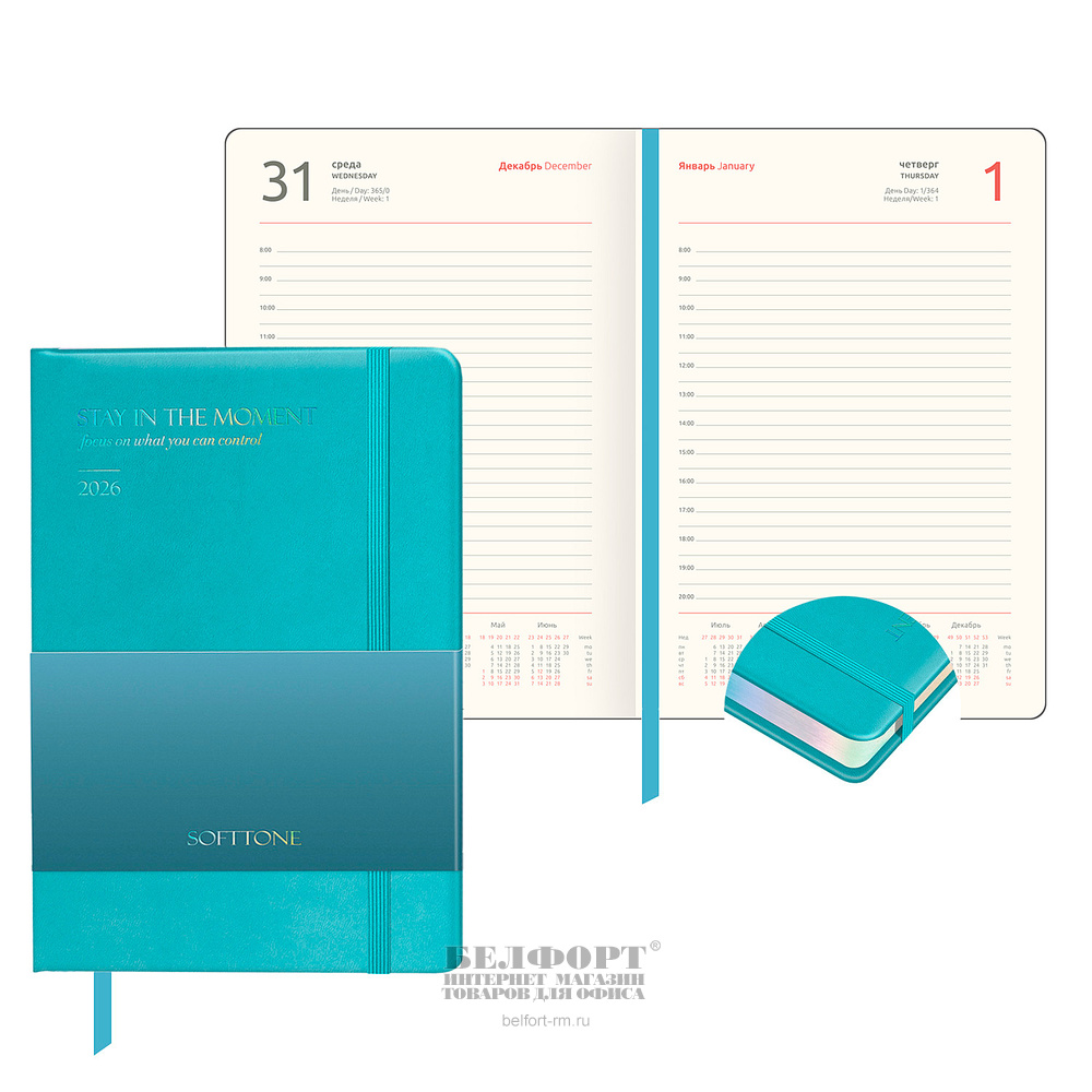 Ежедневник 2026г. А5, кожзам, Greenwich Line, "Softone", "Sky", 176л, 205мм*145мм, в твердом переплете, бирюзовый, тонированный блок, ляссе, голография срез