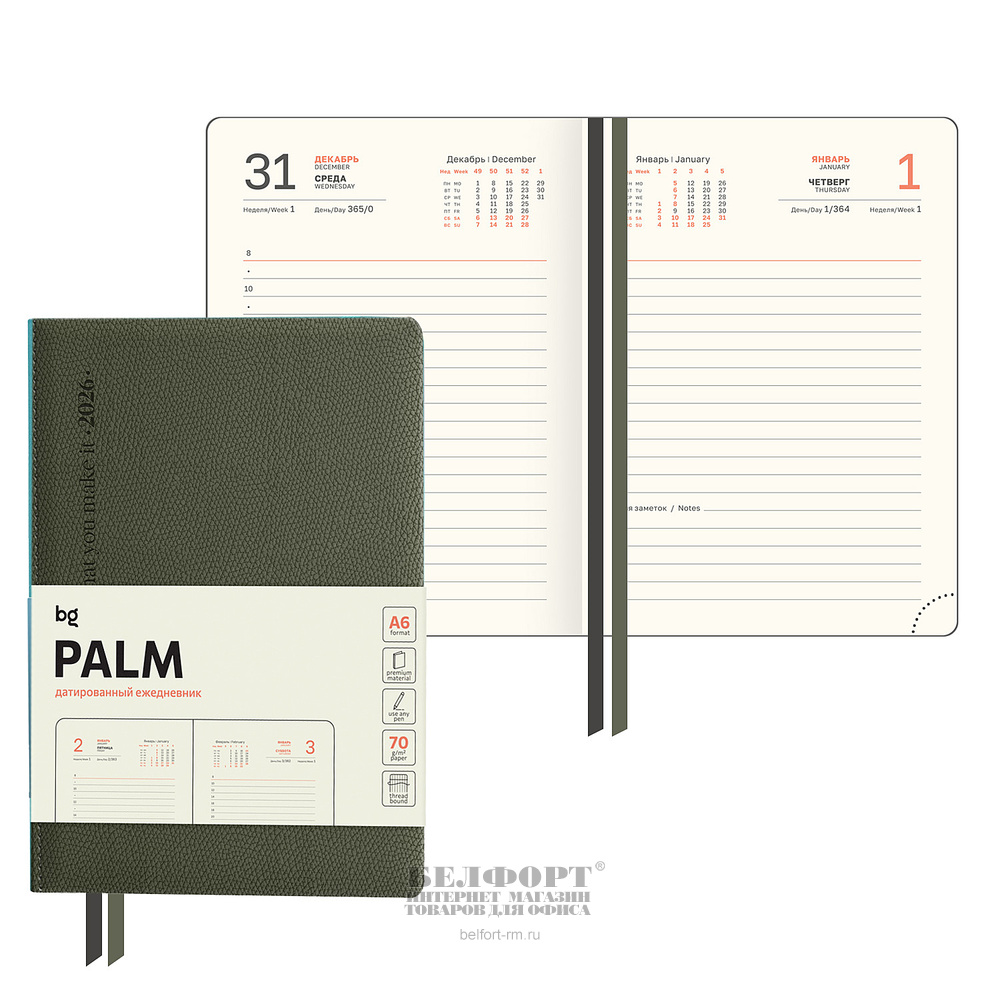Ежедневник 2026г. А6, кожзам, BG, "Palm", "Dark khaki", 176л, 145мм*105мм, в твердом переплете, темно-зеленый, кремовый блок, ляссе, 70г⁄м²