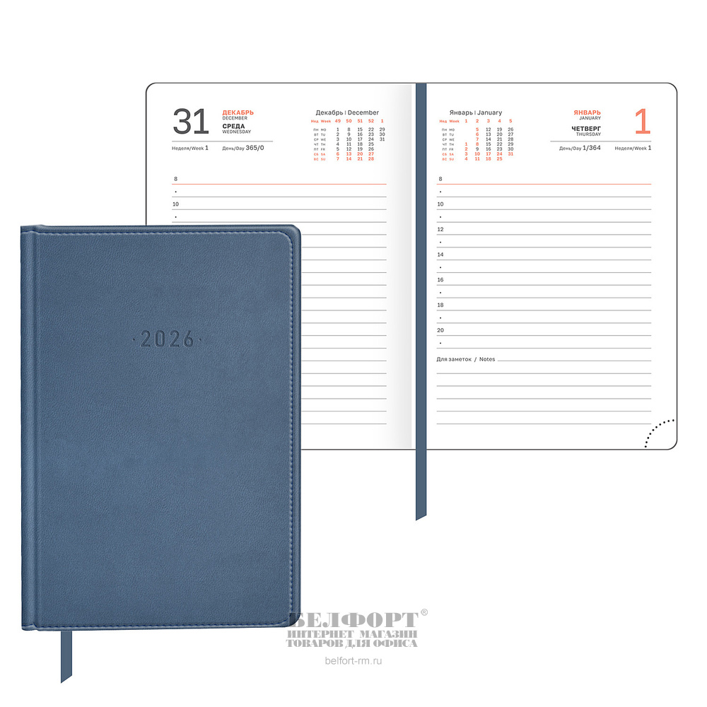 Ежедневник 2026г. А5, бумвинил, BG, 168л, 206мм*135мм, в твердом переплете, синий, белый блок, 60г⁄м²