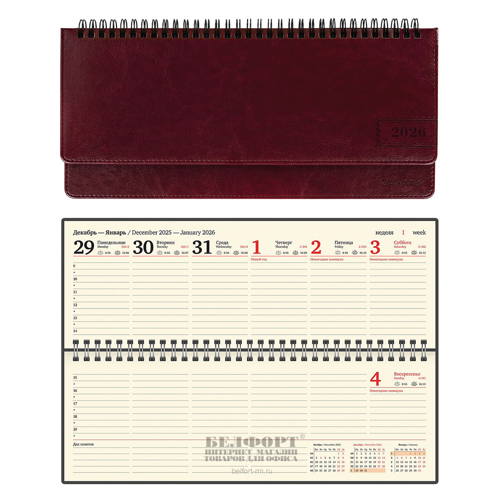 Планинг 2026г. кожзам, Brauberg, "Imperial", 60л, 305мм*140мм, на спирали(гребне), бордовый, кремовый блок