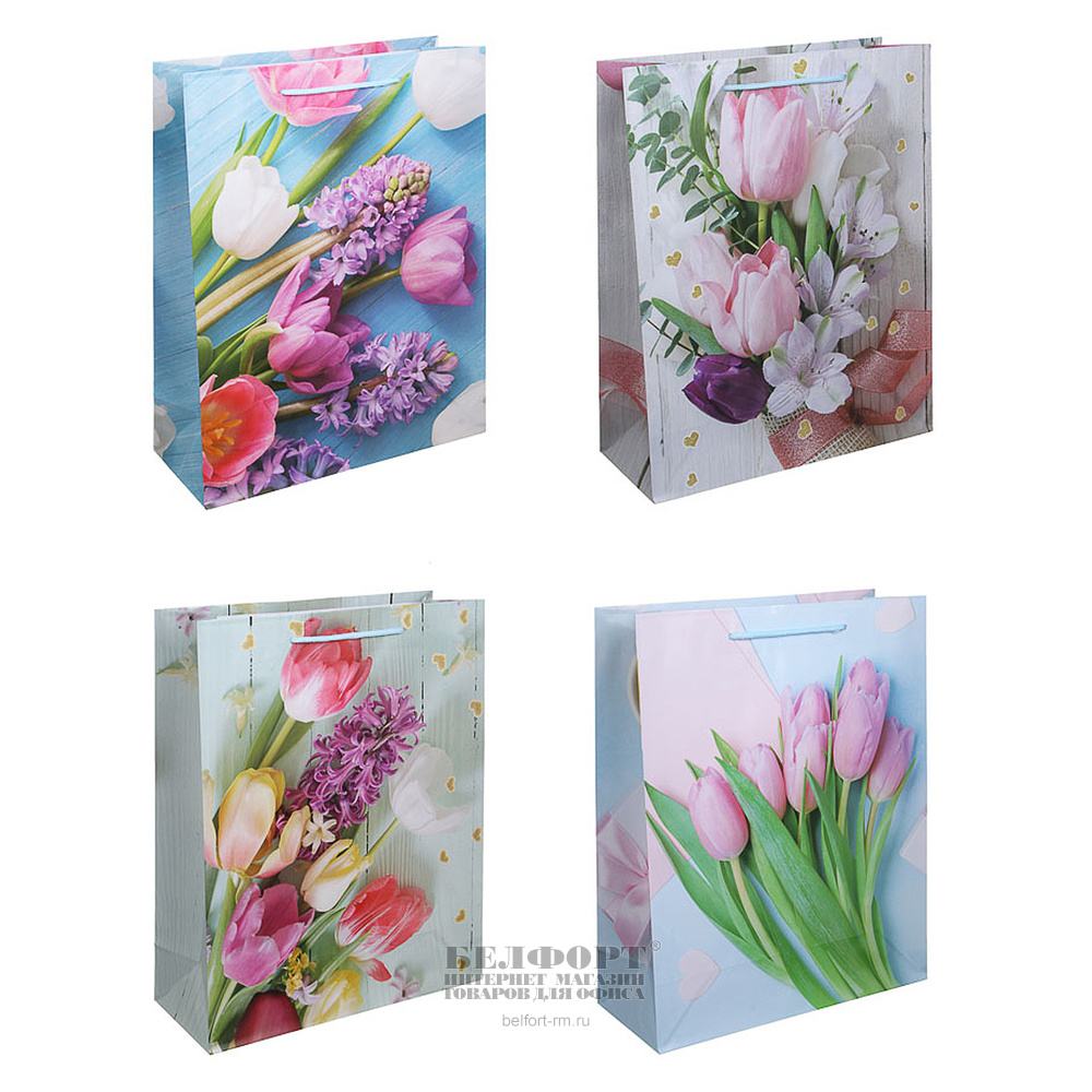 Пакет подарочный бумага, 26см*10см*32см, "Тюльпаны", вертикальный, ассорти
