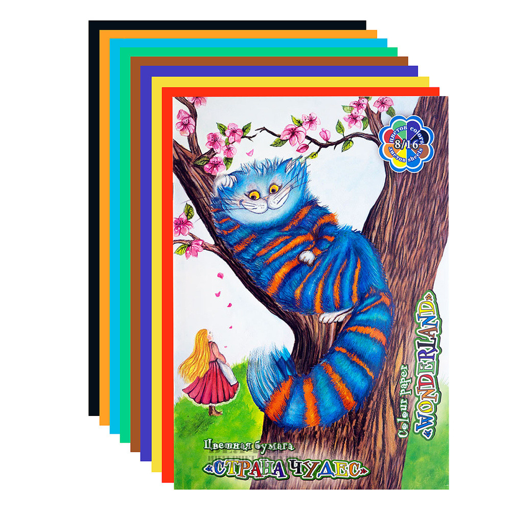 Цветная бумага немелованная, А4, 16л, 8цв, Лилия Холдинг, "Страна чудес. Чеширский кот", двусторонняя, в папке, бумага газетная
