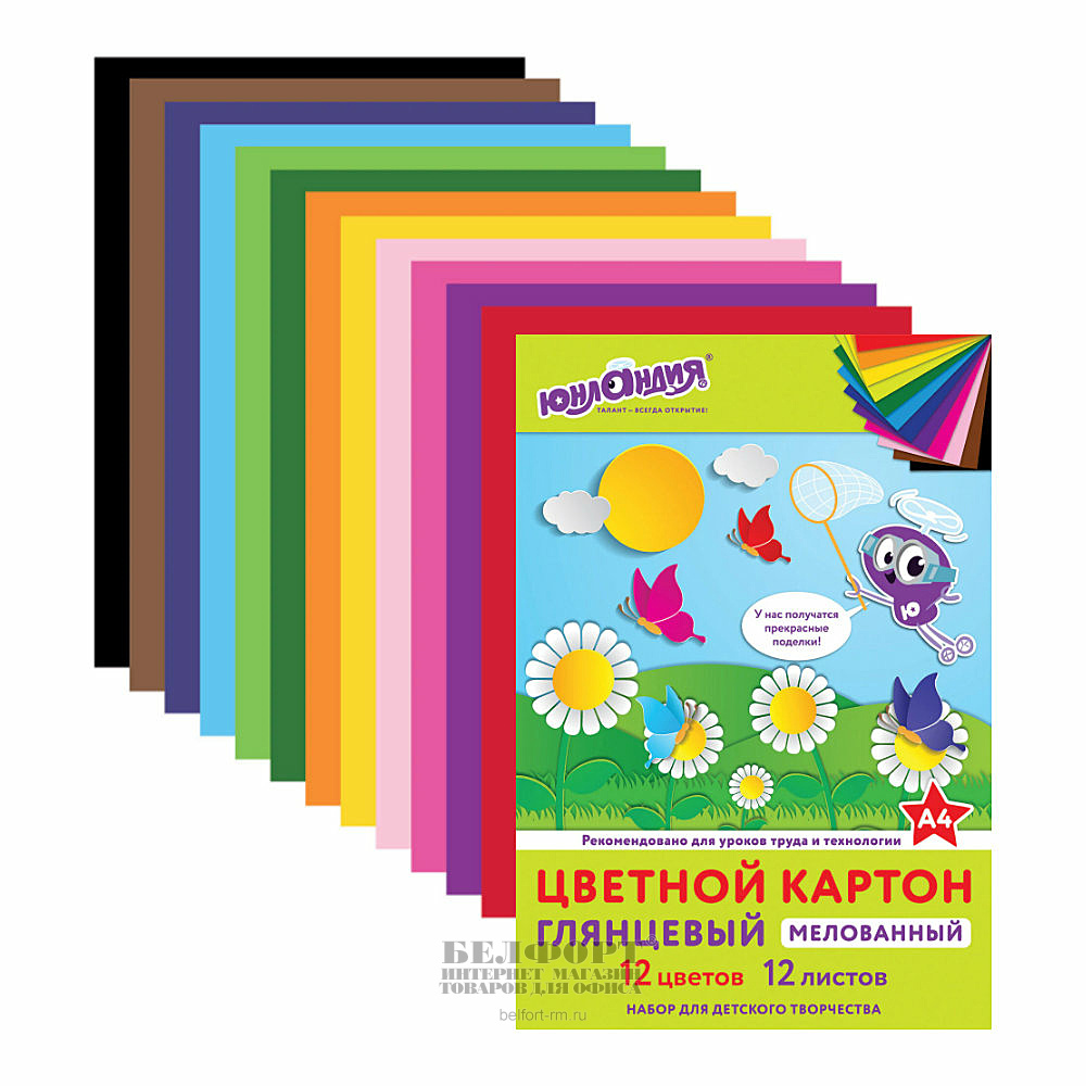 Набор цветного картона А4, 12л, 12цв, Юнландия, "Юнландик на полянке", мелованный, 290мм*200мм, ассорти, мелованный, в папке, 235г⁄м²