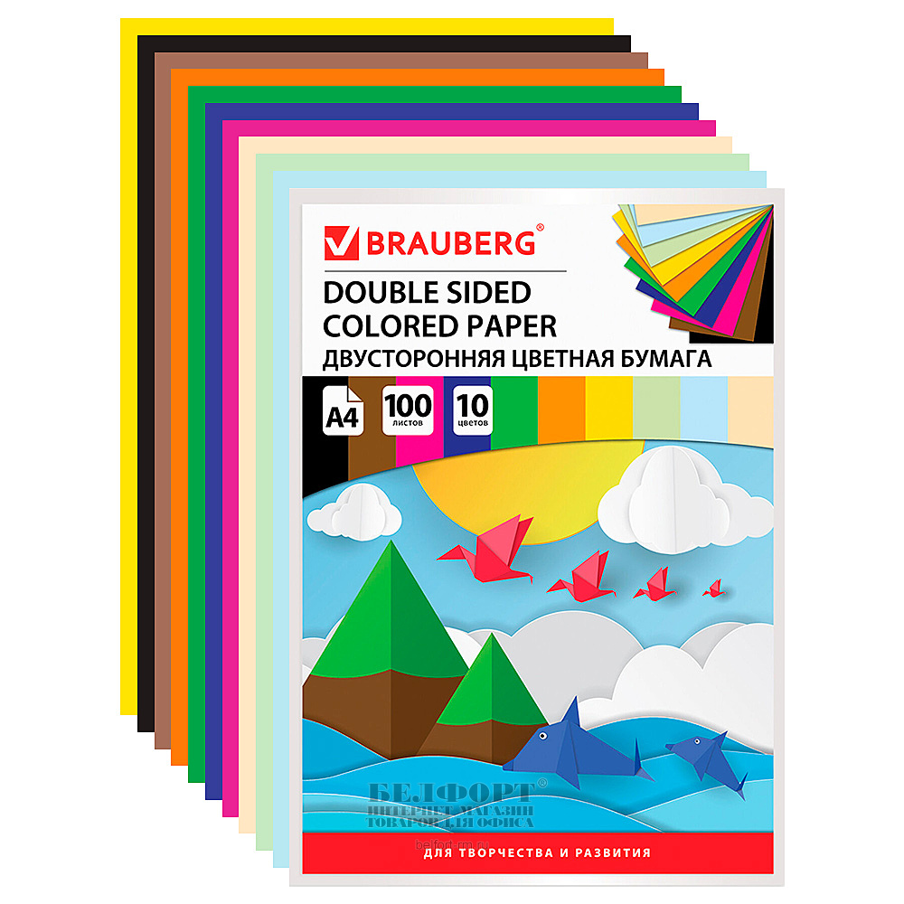 Цветная бумага тонированная в массе, 80г⁄м², А4, 100л, 10цв, Brauberg, 297мм*210мм, двусторонняя, на склейке