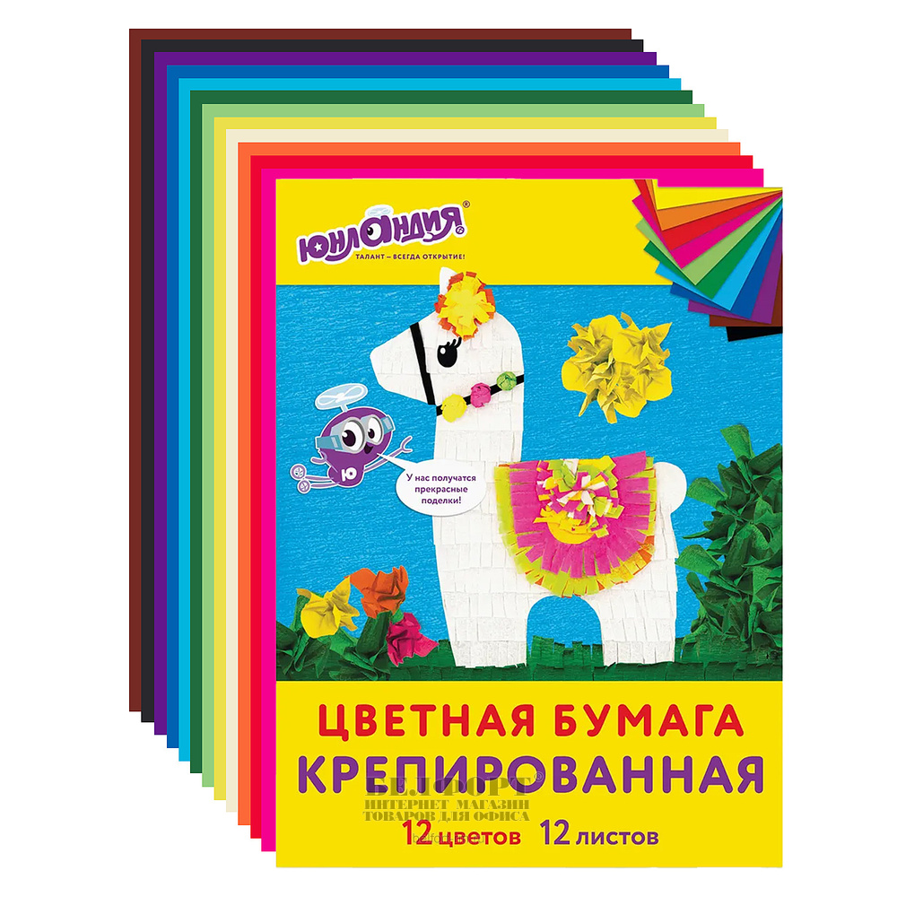 Цветная бумага крепированная, А4, 12л, 12цв, Юнландия, двусторонняя, 32г⁄м², в папке