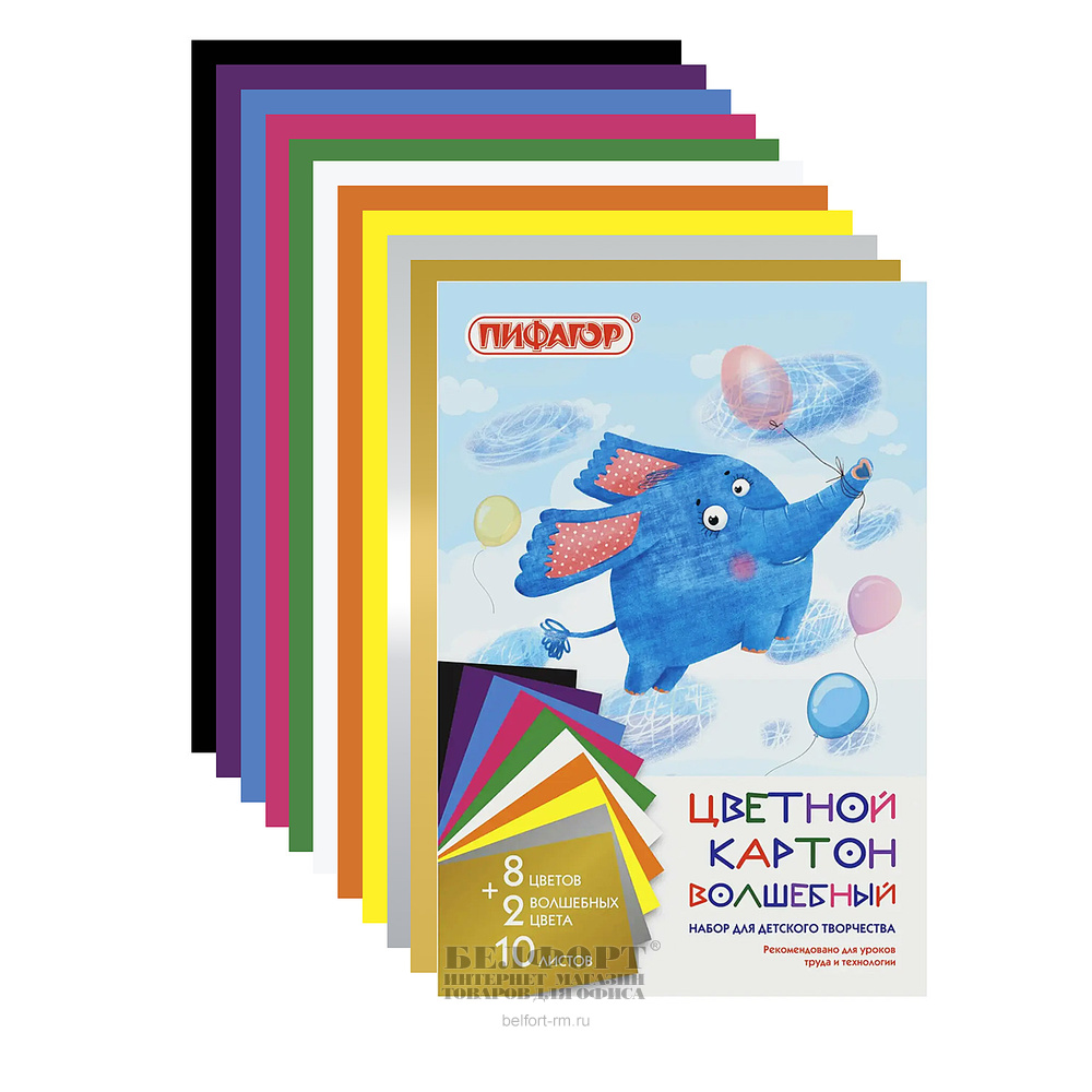 Набор цветного картона А4, 10л, 10цв, Пифагор, "Волшебный. Слоник", немелованный, 290мм*200мм, в папке, 200г⁄м²