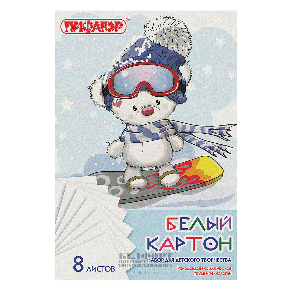 Картон белый А4, 8л, 290мм*200мм, Пифагор, "Мишка на сноуборде", немелованный, в папке, 200г⁄м²