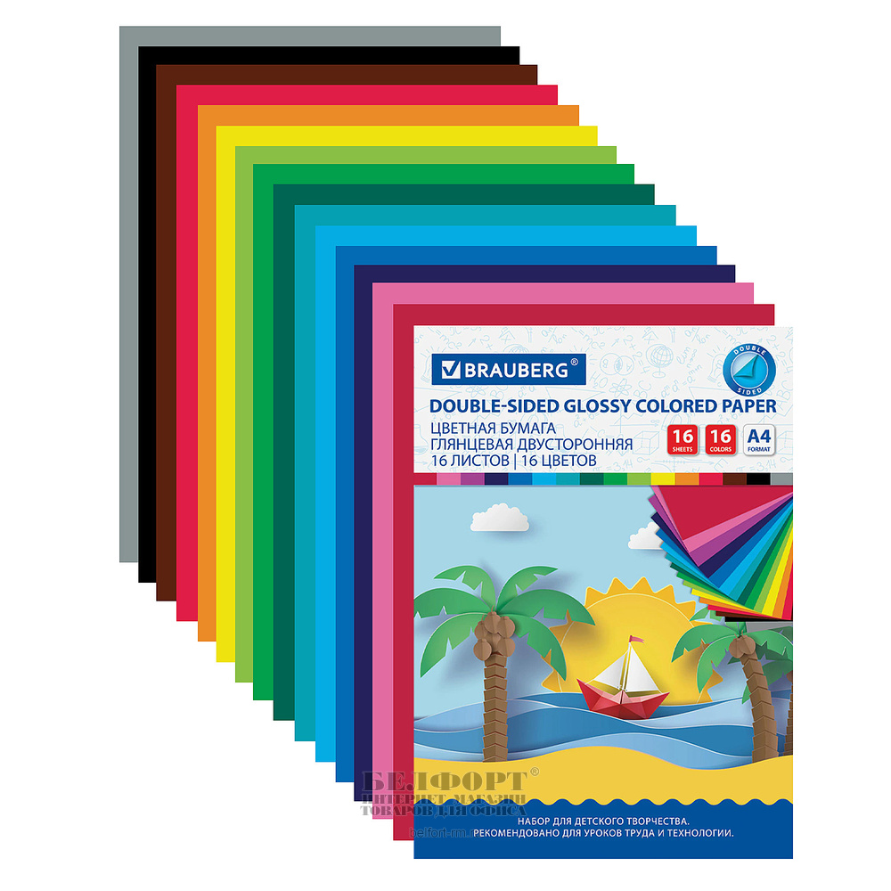 Цветная бумага мелованная, А4, 16л, 16цв, Brauberg, "Кораблик", двусторонняя, на скрепке