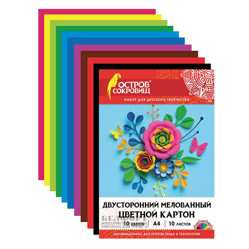 Набор цветного картона А4, 10л, 10цв, Остров сокровищ, мелованный, двусторонний, ассорти, в папке, 200г⁄м²