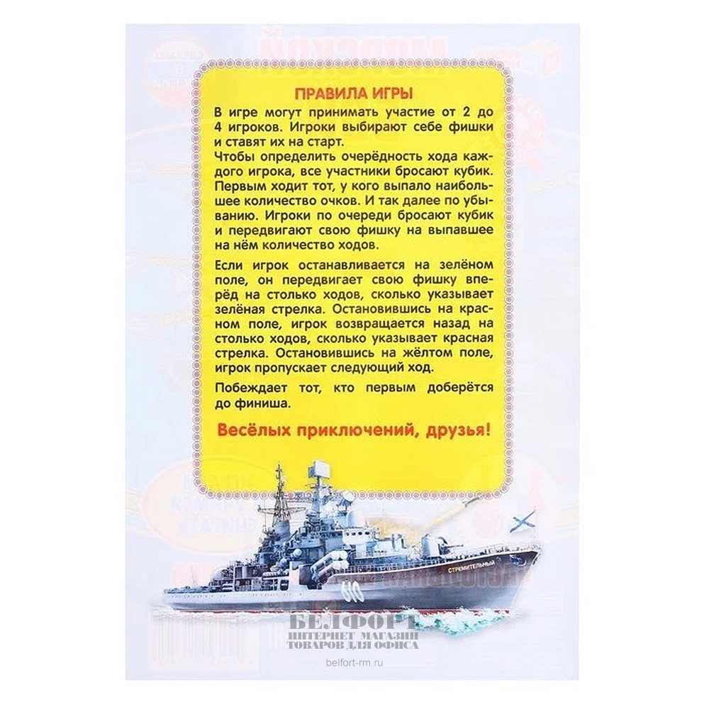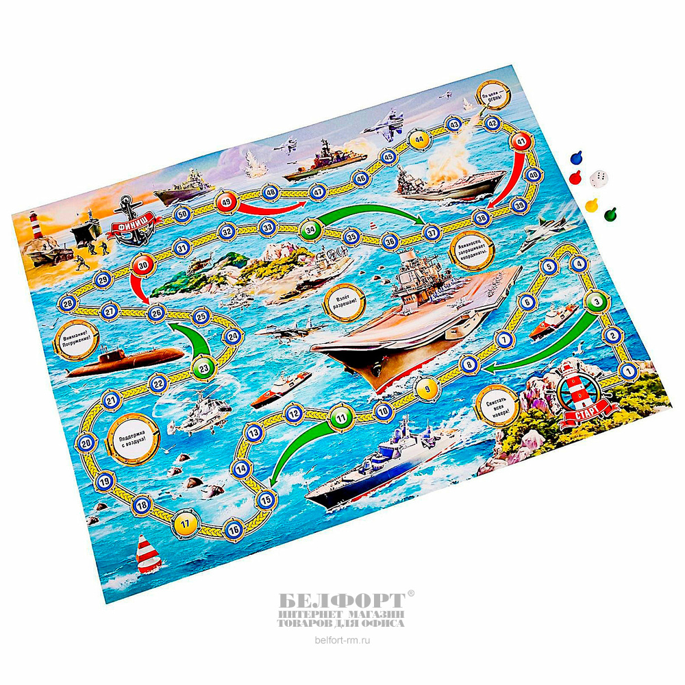 Настольная игра-ходилка "Морской бой" приглашает детей и родителей совершить незабываемое морское путешествие и оказаться в центре опасных и захватывающих водных баталий, где игрокам придется выполнять интересные задания, преодолевать преграды и стремиться первым приплыть к финишу. Игра тренирует навыки счета, развивает внимание, смекалку и воображение.