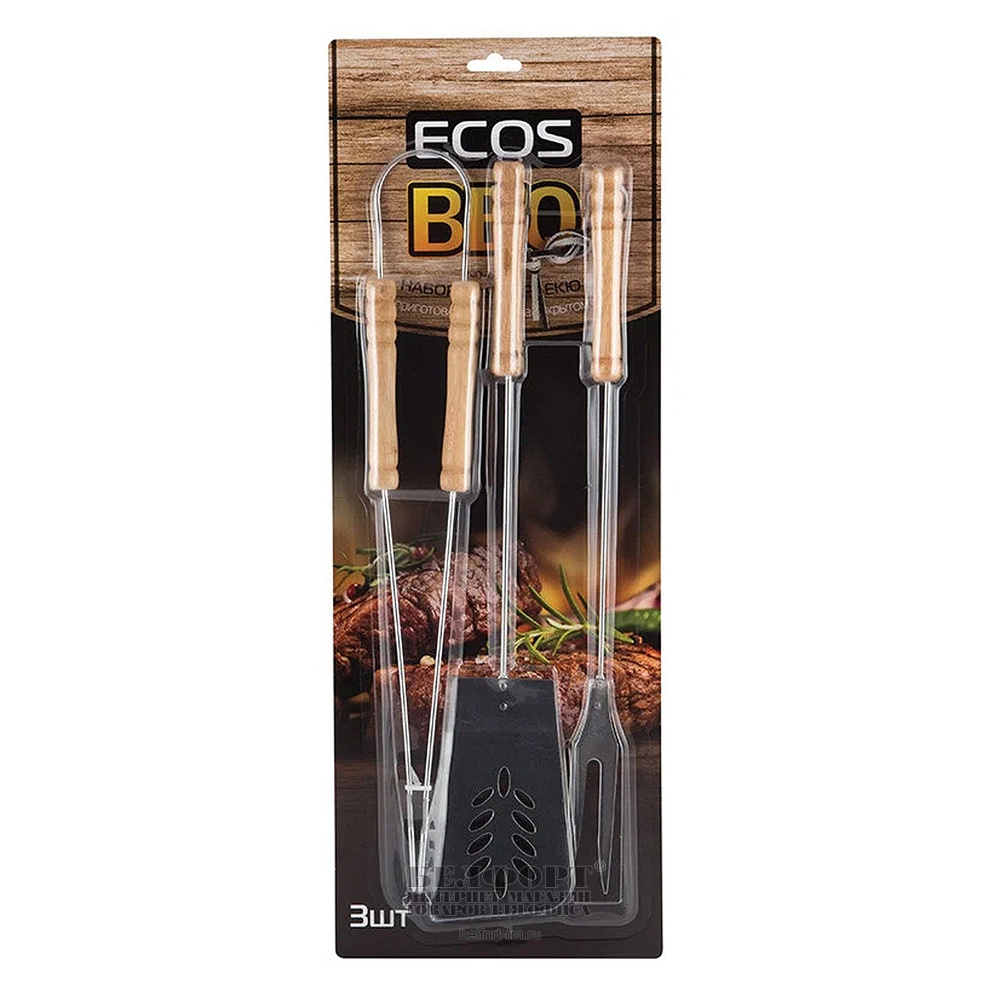 Набор для барбекю Ecos, ND-1095D, нержавеющая сталь, дерево, 3 предметов, щипцы, вилка, лопатка, блистер