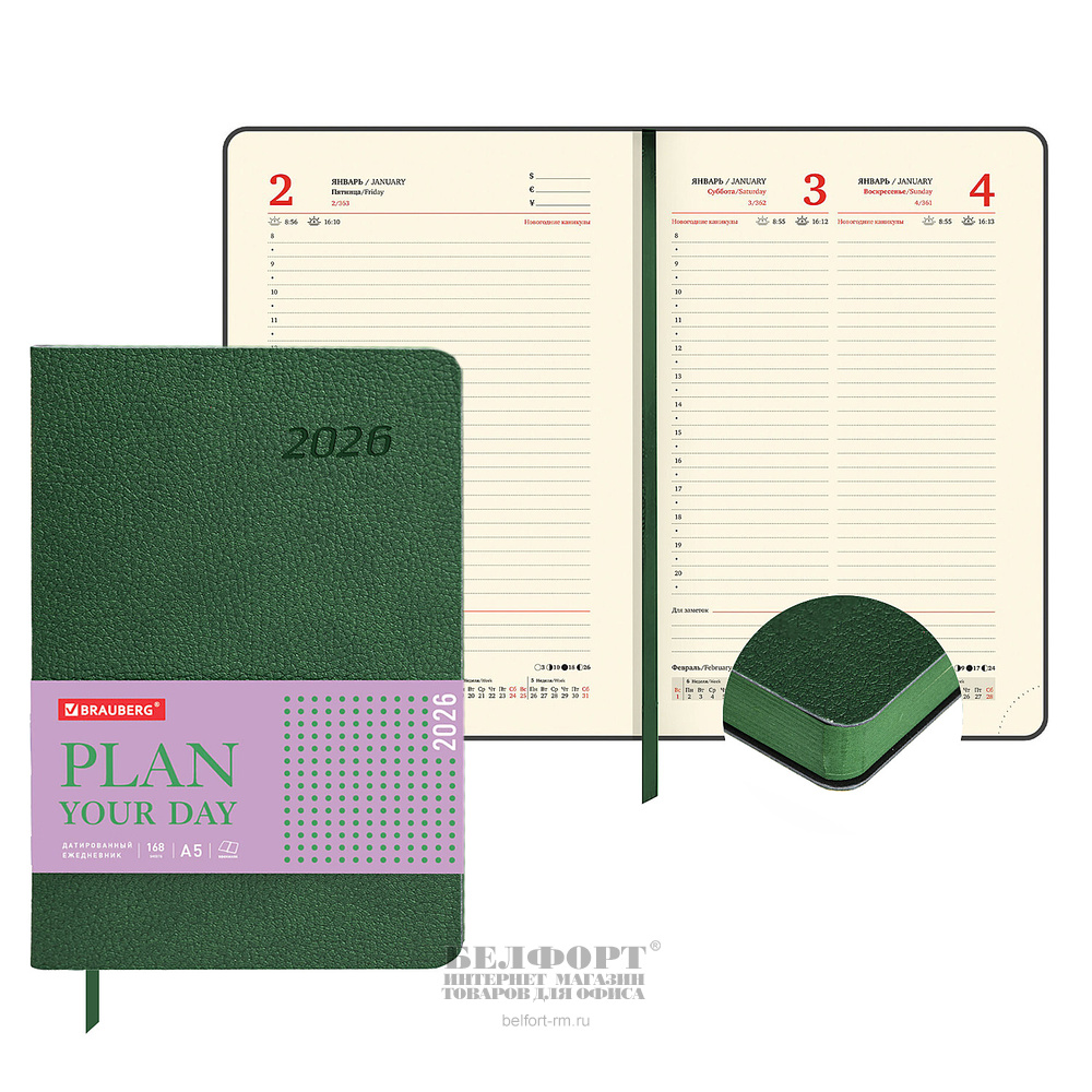 39 Ежедневник 2026г. А5, кожзам, Brauberg, Ежедневник 2026г. А5, кожзам, Brauberg, Ежедневник 2026г. А5, кожзам, Brauberg, "Imperial", 168л, 213мм*138мм, в твердом переплете, темно-зеленый, кремовый блок, ляссе, скругленные уголки 259387 код117066 артикулЕсть в наличии 1 шт.